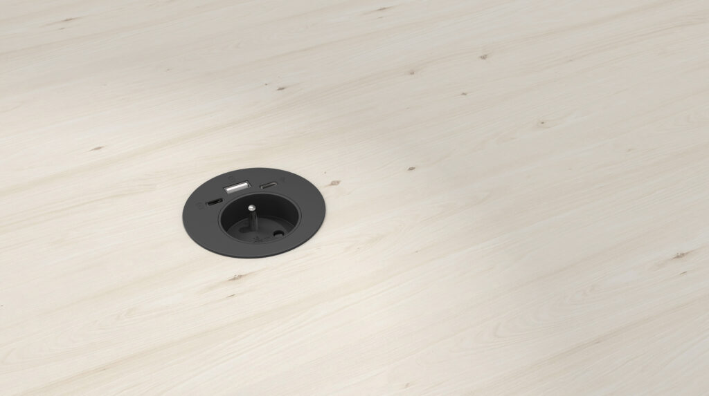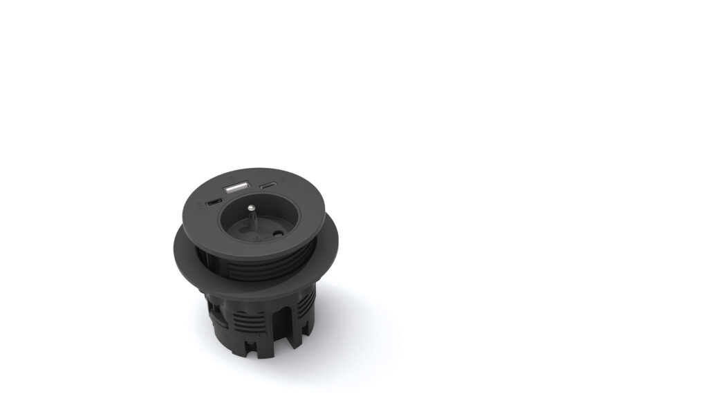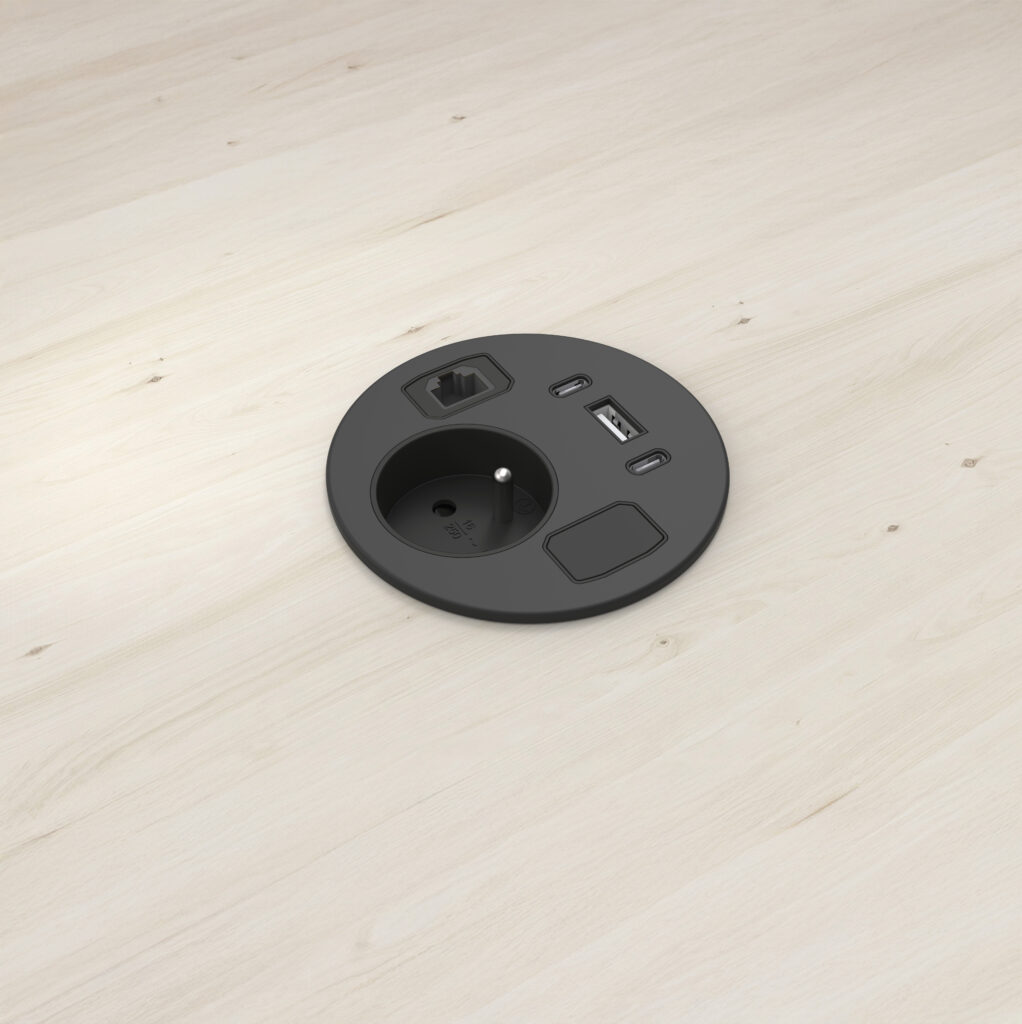 - 1 prise courant fort + USB A 18 W maxi + USB C 30 W maxi + USB C data (câble USB C non fourni) perçage Ø 60 mm (2) Capot coulissant avec chargeur induction 5 W (accessoire pour boîtier BPE 21) perçage Ø 80 mm (2)