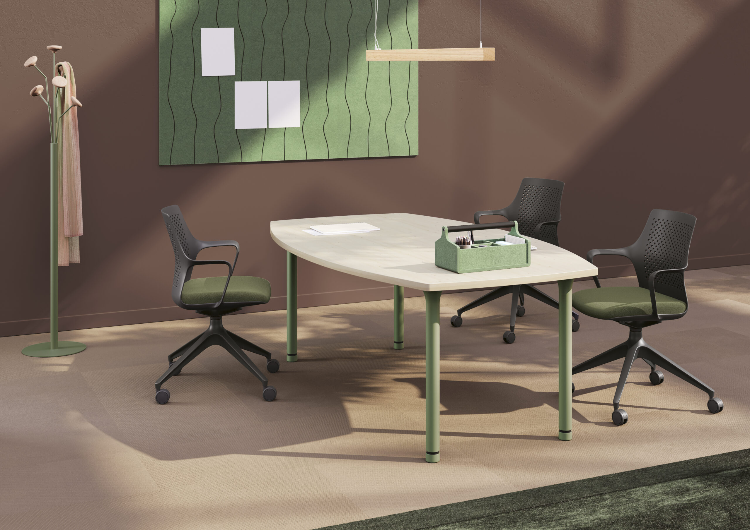 Le modèle TIMMOS associe un plateau en stratifié HPL à un rendu semi-mat conçu pour un effet antireflet.
